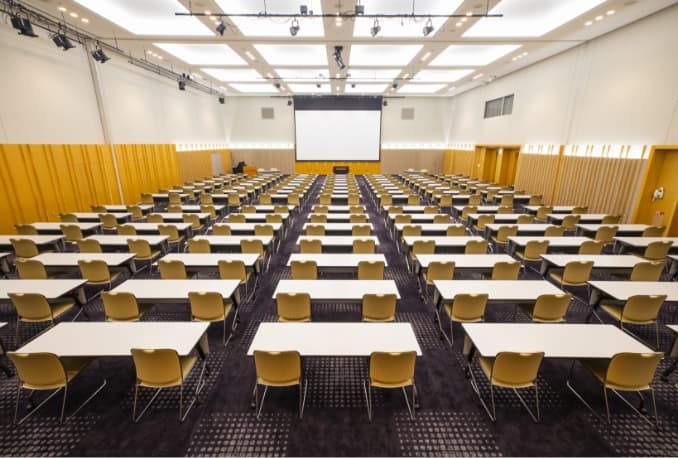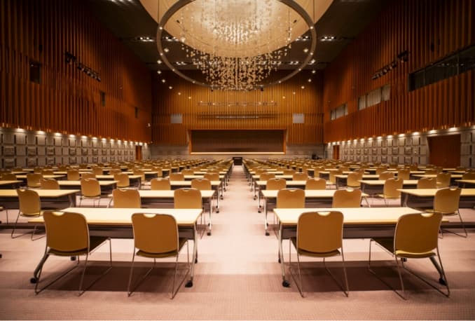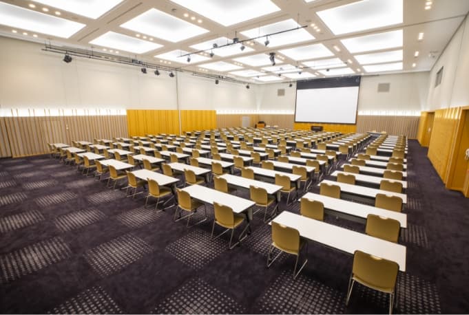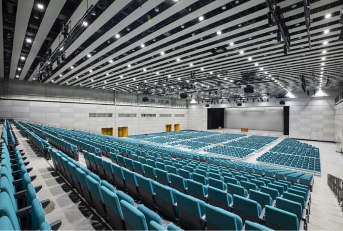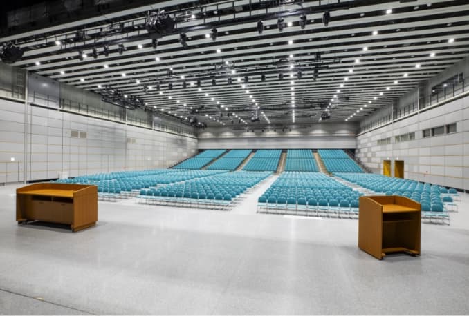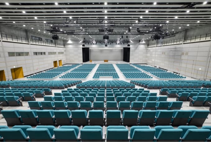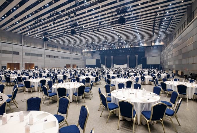 大型会議、展示会、パーティーなどのあらゆる場面に対応可能なホールです。 最大2,500人を収容できるメインホールとしての機能と、約2,600㎡の展示場機能を併せもっています。また、ホール後部には可動席を有しておりますので、各種会議やイベントの会場としても最適です。