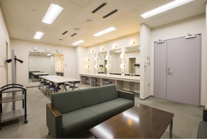 | 2階楽屋 | 楽屋①…約13㎡、4名掛 楽屋②…約32㎡、8名掛、シャワー室、トイレ、洗面台 |